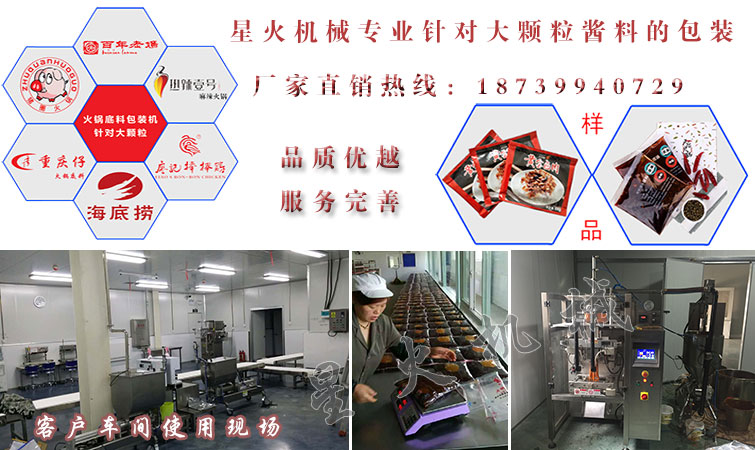 醬料包裝機(jī)系列是星火機(jī)械力推的一系列包裝設(shè)備,也是銷售量較好的機(jī)械設(shè)備,該系列包裝機(jī)主要對(duì)顆粒醬料及粘稠醬料進(jìn)行包裝,如:火鍋底料、豆豉醬、辣椒醬、牛肉醬等各種調(diào)料的包裝,目前我司已經(jīng)與很多知名醬料企業(yè)合作,歡迎廣大新老客戶前來(lái)我司考察監(jiān)督。下面幾款醬料設(shè)備就是星火賣的比較好的幾款醬料包裝機(jī)產(chǎn)品。